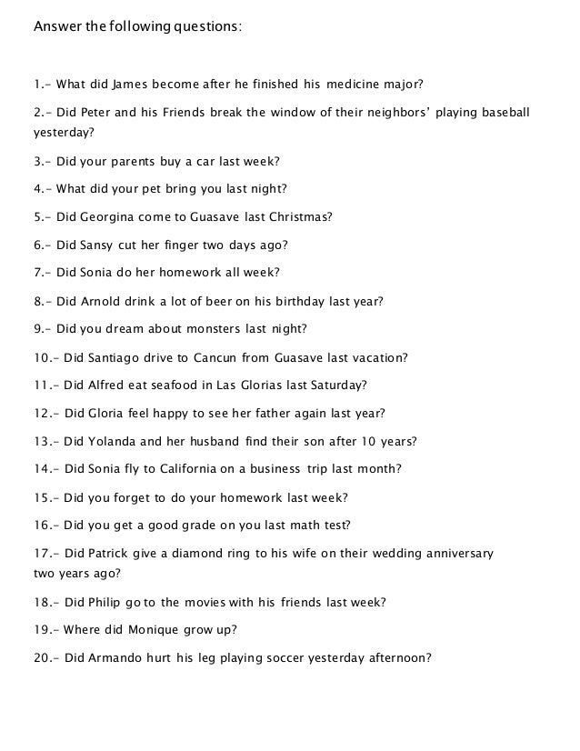 First read the questions and then choose ten and answer them using full sentences with past time expressions. Wasn't didn't was didn't be. In this video, i will be. Do you want to practise using past simple questions in english? Please be sure to answer the question.