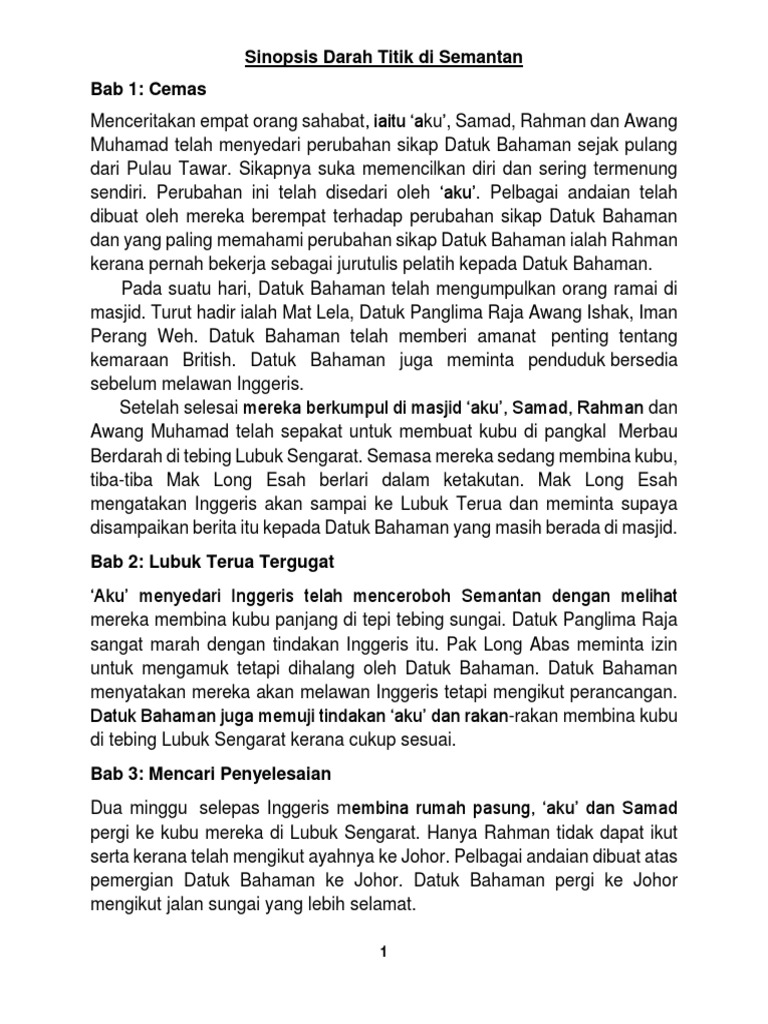 Perubahan ini telah disedari oleh 'aku'. Rahman mengatakan bahawa dua tahun dahulu. Sinopsis darah titik di semantan komsas tingkatan 2. 1 @miminkays.brainly darah titik di semantan bab 1 menceritakan empat orang sahabat iaitu aku, samad, rahman dan awang muhamad telah menyedari perubahan sikap datuk bahaman sejak pulang dari pulau tawar. Sinopsis sejak pulang dari pulau tawar, sikap datuk bahaman banyak berubah.
