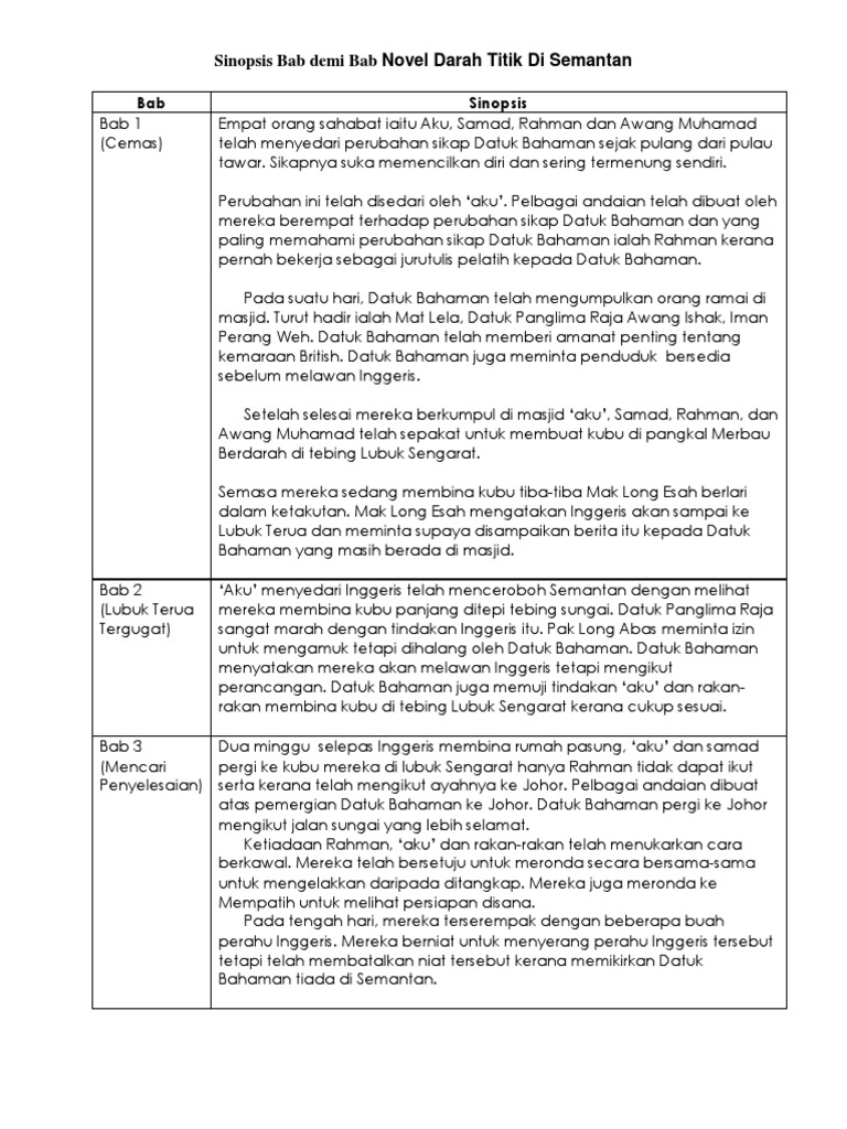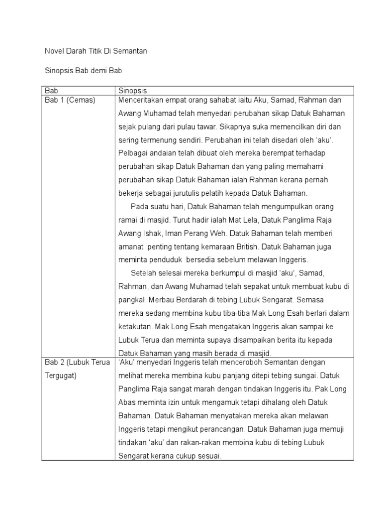 Related : Sinopsis Novel Darah Titik Di Semantan / Ejercicio De Sinopsis Novel Pantai Kasih - 1 @miminkays.brainly darah titik di semantan bab 1 menceritakan empat orang sahabat iaitu aku, samad, rahman dan awang muhamad telah menyedari perubahan sikap datuk bahaman sejak pulang dari pulau tawar..